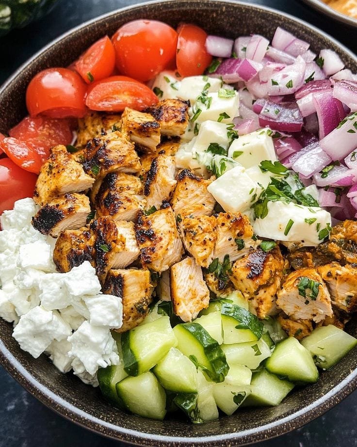 Start with rice or quinoa, then layer on salad, sliced chicken, a big spoonful of tzatziki, and top with feta and fresh herbs. Serve with lemon wedges and warm pita if desired.