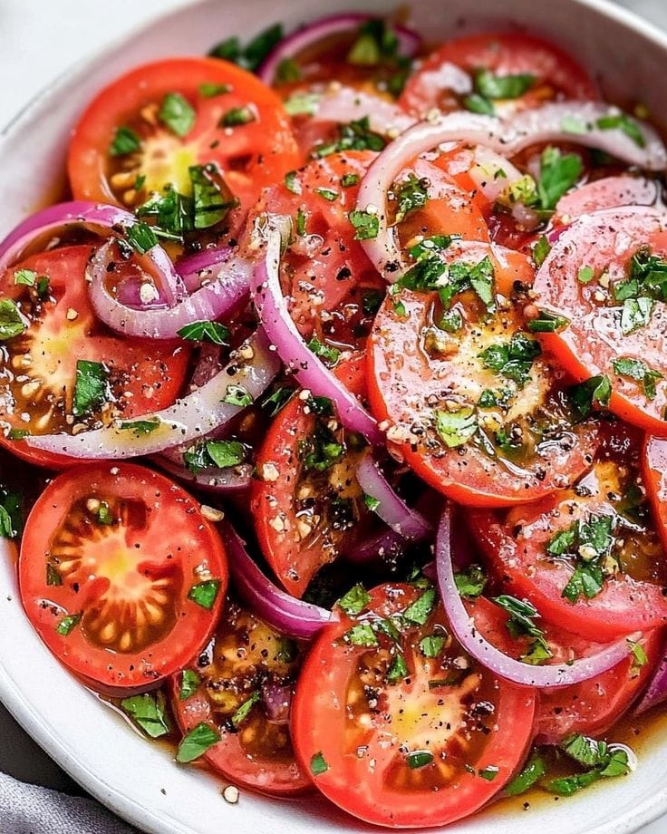 This juicy marinated tomato salad is bursting with bright flavor, fresh herbs, and a hint of garlic. It’s quick to prepare and gets better as it sits, making it perfect for picnics, barbecues, or anytime you have amazing tomatoes on hand.