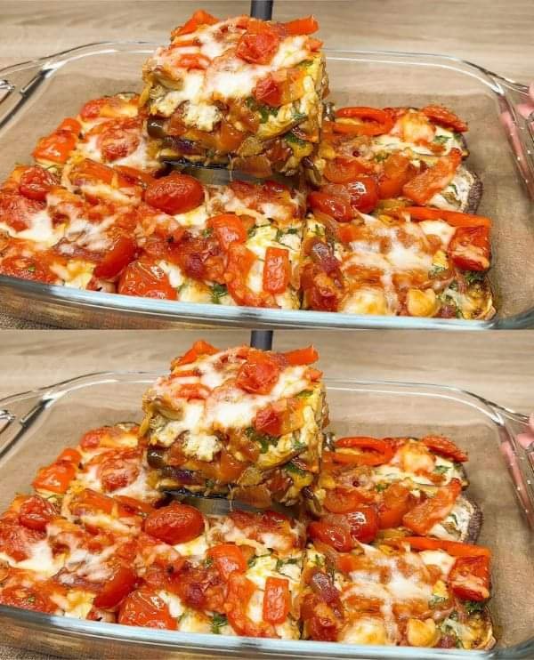 ⭐Layer the baked eggplant slices in the dish, stuffing them with the parsley mixture and sautéed vegetables.