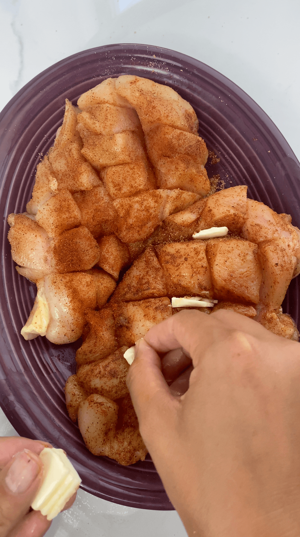 1. Score the chicken by cutting 3/4-inch-thick slices through it without going through. I did both vertical and horizontal cuts.