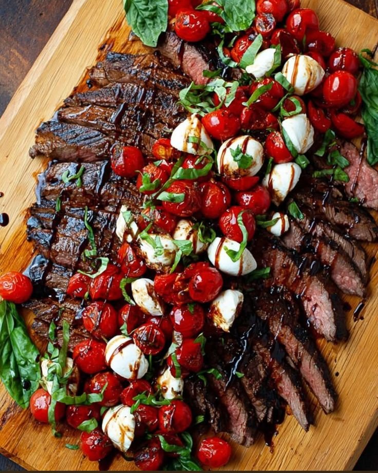Tender balsamic-marinated flank steak, grilled to perfection and sliced thin, layered over a classic Caprese of tomatoes, mozzarella, and basil. Finished with balsamic glaze and olive oil — fresh, savory, and seriously impressive.