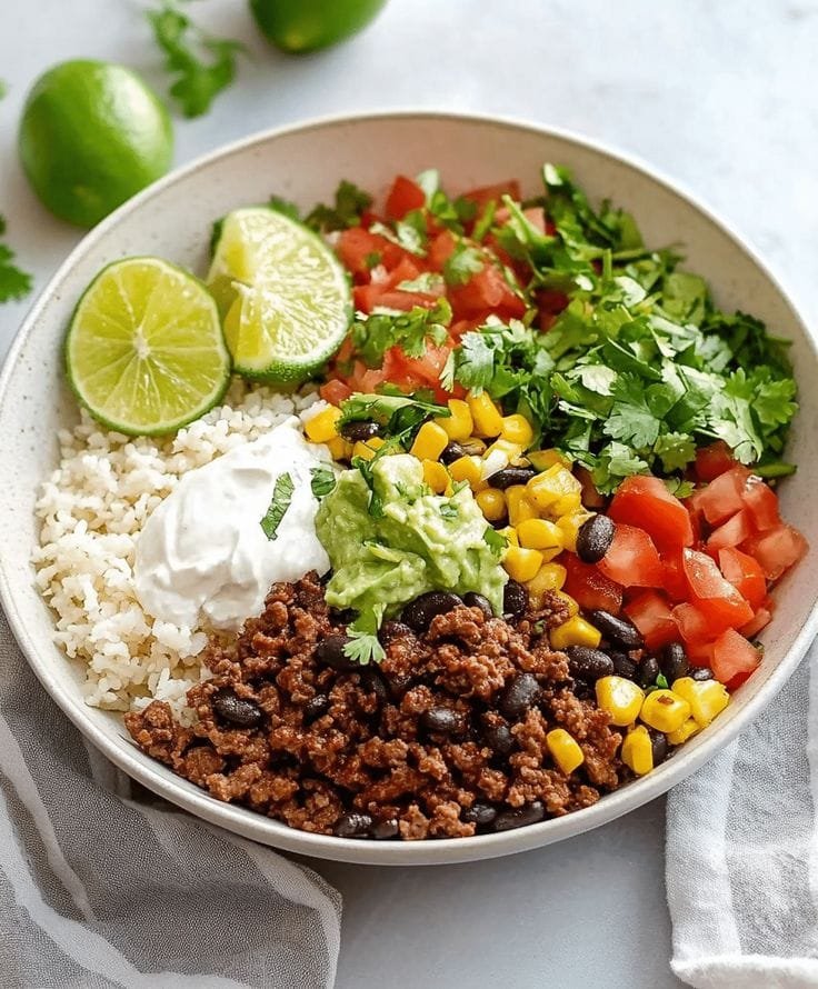 A flavorful and satisfying bowl layered with seasoned ground beef, fluffy rice, black beans, veggies, and your favorite toppings. Perfect for a weeknight dinner, meal prep, or a family-style DIY taco night.