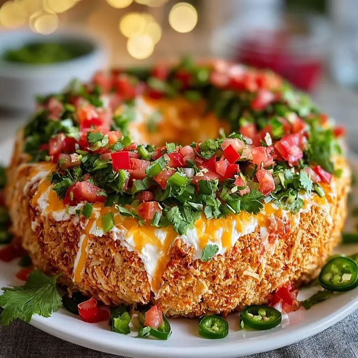 This Christmas Taco Cheese Ball Wreath is a festive, savory, and crowd-pleasing holiday appetizer shaped like a holiday wreath. It combines creamy cheese, taco seasoning, green onions, jalapeno (optional), shredded cheddar, and spices, rolled in colorful toppings like parsley, bell peppers, and crushed tortilla chips.
