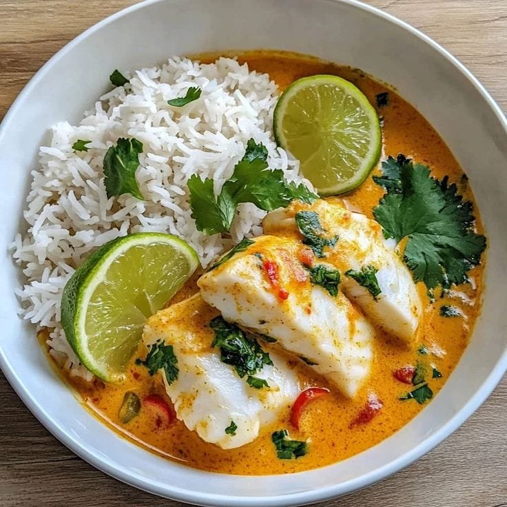 This coconut lime fish curry is a light, fragrant, and satisfying dish that combines flaky white fish with creamy coconut milk, fresh lime, and aromatic spices. Served with fluffy jasmine rice, it’s a cozy weeknight dinner that’s ready in under 30 minutes and dairy-free.