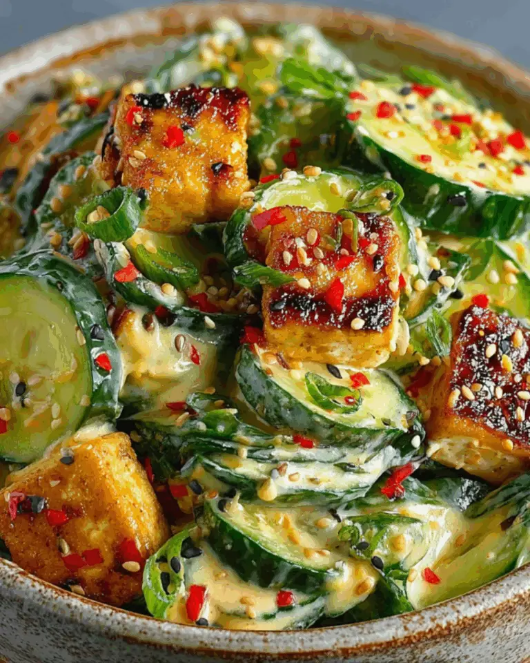 Easy Creamy Asian Cucumber Salad with Crispy Tofu