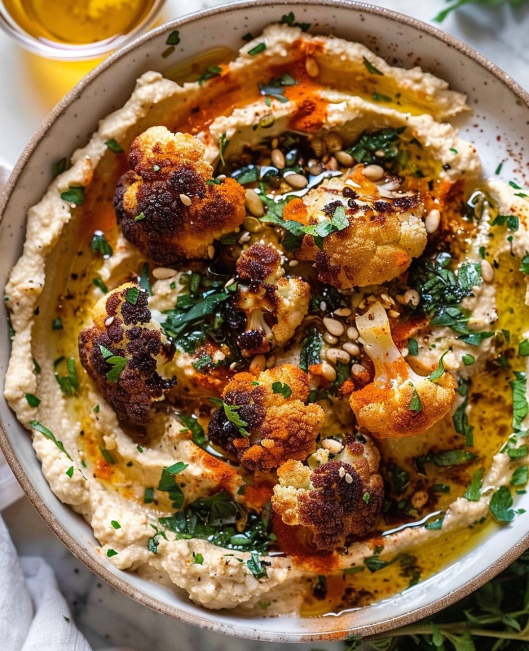 This dish pairs golden, crispy roasted cauliflower with smooth, lemony hummus for a beautiful contrast of textures and flavors. Finished with olive oil and herbs, it’s a wholesome Mediterranean favorite—perfect as an appetizer, side dish, or vegetarian main served with pita.