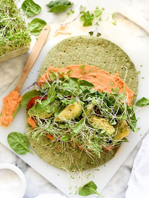 This fresh, crunchy, Mediterranean-inspired wrap uses spinach or green tortillas, a thick layer of creamy hummus, and lots of crisp veggies for a healthy, energizing meal.