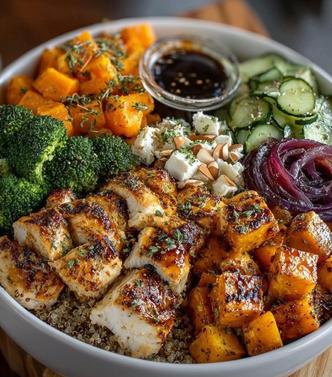 This maple Dijon chicken bowl is the kind of meal that checks every box. It’s hearty, balanced, and full of contrast. You get sweet and tangy glazed chicken, roasted vegetables, fluffy quinoa, and fresh crunchy toppings all in one bowl. It’s simple enough for a weeknight but feels thoughtfully put together, making it ideal for meal prep or a satisfying lunch or dinner.