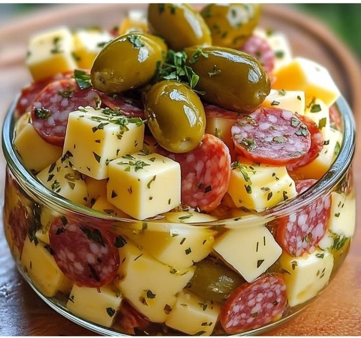 A bold, briny appetizer made with sliced salami, crunchy pickles, olives, and cheese, all lightly marinated in olive oil, vinegar, and herbs.It’s effortless, flavorful, and ideal for Christmas platters, cocktail parties, or mezze board.