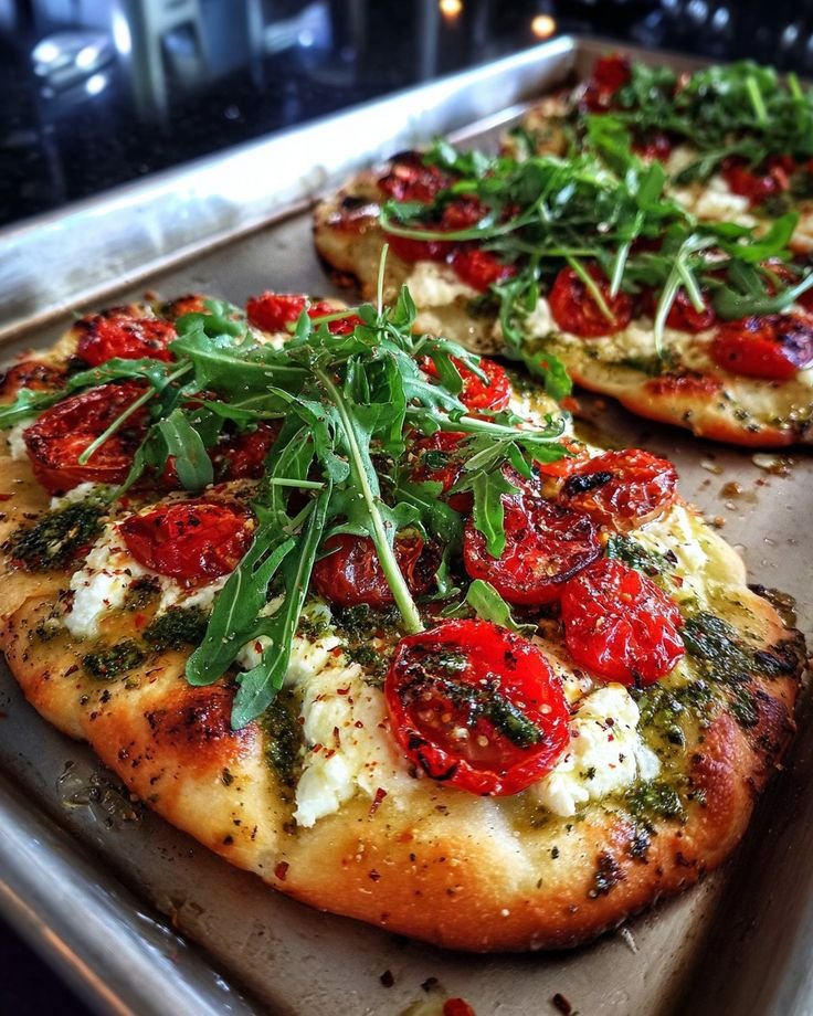 This Mediterranean-inspired flatbread is quick, fresh, and packed with flavor. Sweet roasted tomatoes, creamy goat cheese, vibrant pesto, and peppery arugula sit on a crispy flatbread base. It’s perfect as a light lunch, appetizer, or snack. Non-spicy, colorful, and elegant—ready in under 25 minutes.