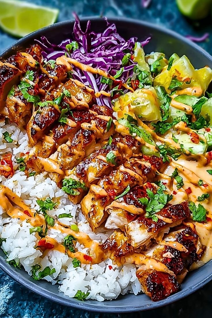 This bowl is a fusion of sweet and savory flavors inspired by Asian and Mediterranean freshness — juicy chicken coated in a tangy-sweet chili glaze, served over rice with crisp veggies and a light drizzle of sauce. It’s quick to make, healthy, and perfect for lunch or dinner.