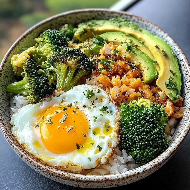 This Egg & Veggie Rice Bowl with Avocado is a simple, nourishing meal that’s packed with protein, fiber, and healthy fats. Fluffy rice is topped with sautéed seasonal vegetables, softly cooked eggs, and creamy avocado for a balanced, satisfying bowl—perfect for breakfast, lunch, or a quick dinner.