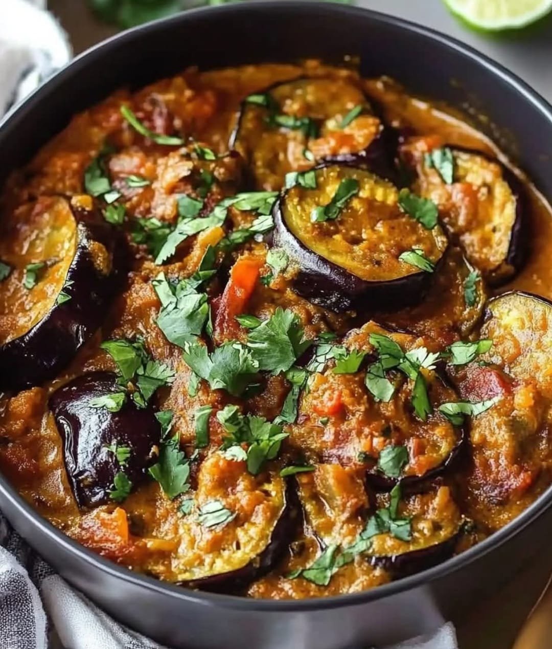 Eggplant curry, also known as Baingan Masala in Indian cuisine, is a rich, flavorful dish featuring tender eggplant cooked in a spiced tomato-based sauce. This curry is packed with aromatic spices, garlic, and ginger, creating a comforting meal that pairs beautifully with rice or flatbread. It’s a great vegetarian or vegan option that is both nutritious and satisfying.
