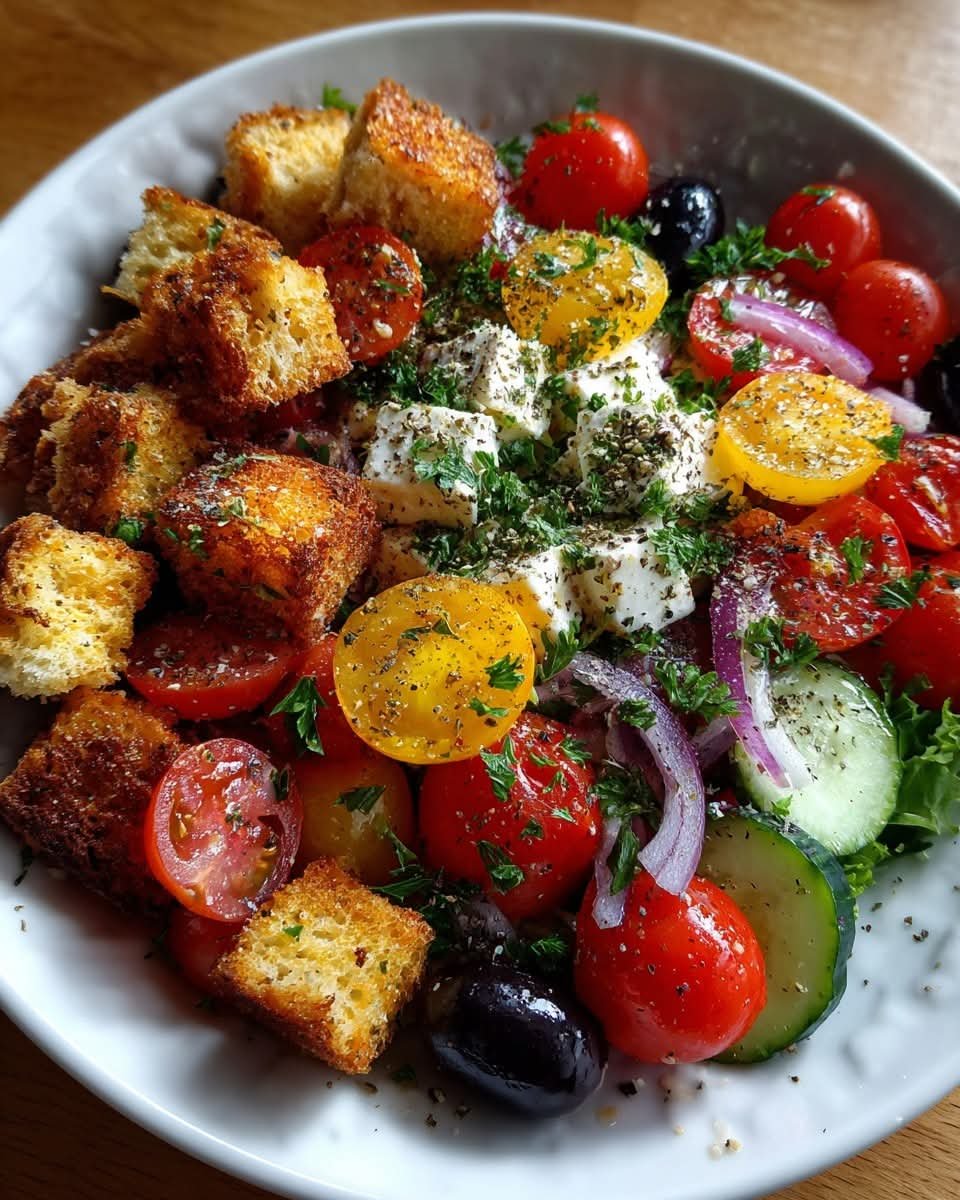 This vibrant Mediterranean-inspired salad combines juicy ripe tomatoes, briny olives, and creamy feta cheese, tossed with fresh herbs and a light vinaigrette. Crunchy, garlicky croutons add texture and a punch of flavor, making it perfect as a starter, side, or light meal. The mix of colors, textures, and flavors creates a refreshing, savory experience that’s quick to assemble but feels gourmet.