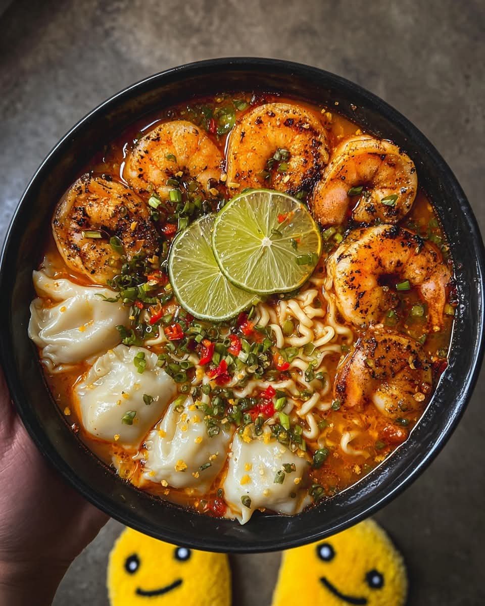 This bowl is a fusion of comforting Japanese-style ramen and bold Southeast-Asian flavors. Juicy shrimp and tender dumplings simmer in a spicy aromatic broth enriched with garlic, ginger, chili paste, and soy. Springy noodles soak up the heat, while soft-boiled eggs add richness and lime brightens everything at the end. It’s warming, flavorful, and surprisingly simple to make.