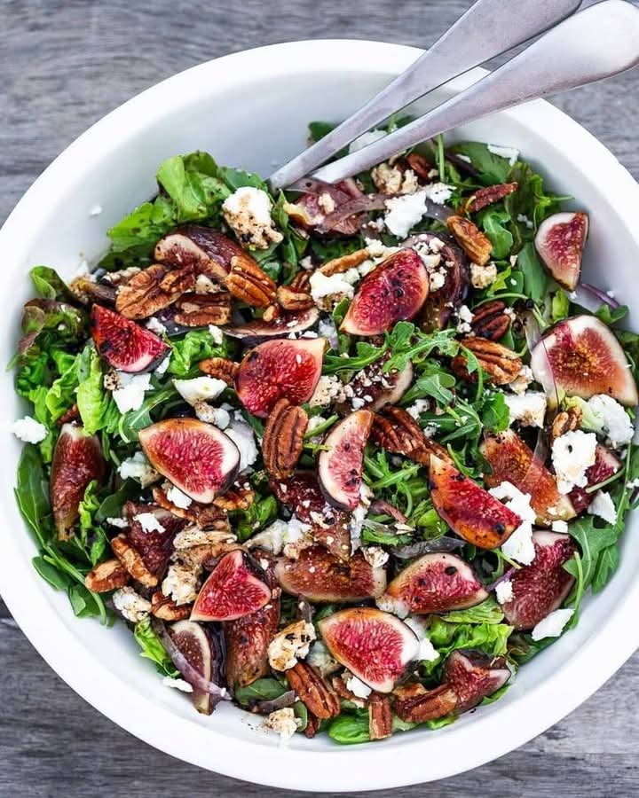 - . Assemble the Salad:Place the arugula in a large salad bowl or on a serving platter. Arrange the quartered figs and thinly sliced red onion on top. Scatter the toasted pecans and goat cheese (if using) over the salad.