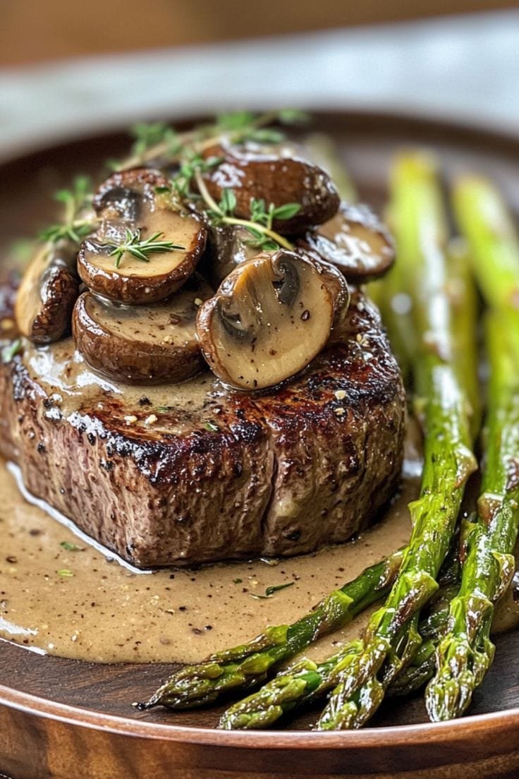 This restaurant-quality filet mignon is seared to perfection and topped with a rich, savory mushroom sauce. Paired with tender-crisp roasted asparagus, it’s a luxurious yet simple dinner that’s ideal for special occasions or a gourmet night in.