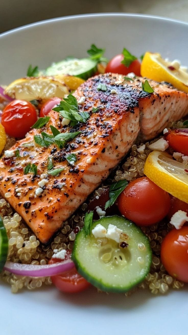 Juicy salmon fillets are marinated in a garlic-herb blend, then grilled until tender and flaky. Served over a vibrant quinoa salad with fresh vegetables and lemony dressing, this dish is both nourishing and delicious.
