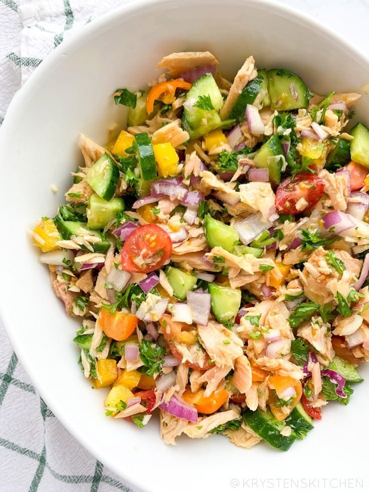 A bright, crunchy, and herby salad inspired by classic Greek flavors — juicy cherry tomatoes, crisp cucumber, red onion, kalamata olives, and flaky tuna tossed in a lemon-olive oil dressing. It’s the ultimate easy lunch or light dinner, full of freshness and nutrition.