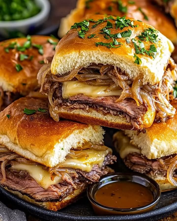French Dip Sliders are mini sandwiches packed with thinly sliced roast beef, melted provolone cheese, and caramelized onions on soft slider rolls, served with a rich au jus dipping sauce. They’re perfect for game day, parties, or a comforting dinner.