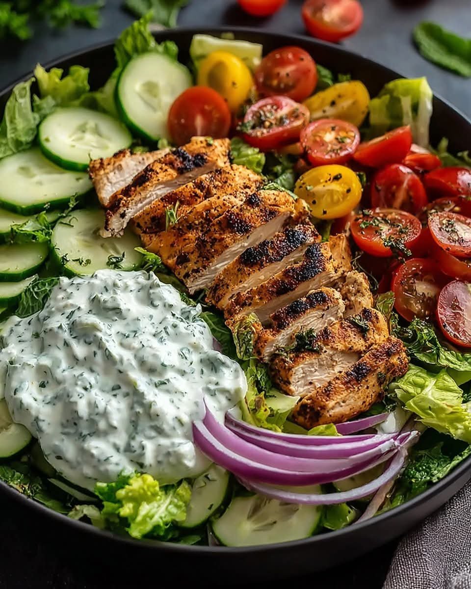 A vibrant and wholesome bowl packed with tender grilled chicken, crisp fresh vegetables, and a creamy, zesty herb dressing. This bowl is perfect for a nutritious lunch or dinner, combining protein, fiber, and healthy fats in every bite. The dressing ties everything together with a refreshing burst of flavor without overpowering the natural freshness of the ingredients.