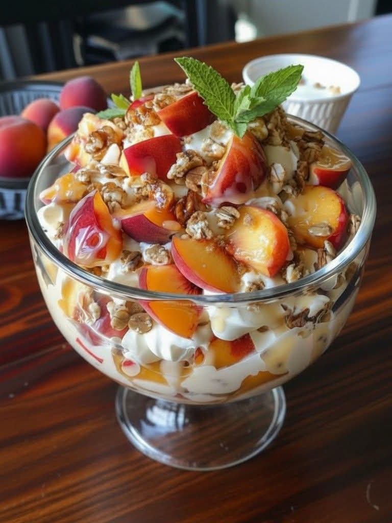 Fresh Peach Yogurt Granola Bowl —