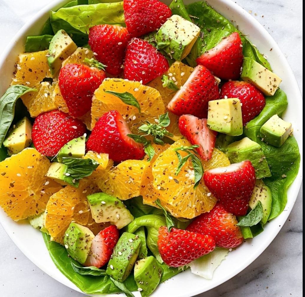 - Put the lettuce through a water rinse and then drain it. First, pat it dry with a towel, and then put it in the bottom of the kitchen bowl. Add oranges, strawberries, and avocado to the mixture. The thyme should be sprinkled over the whole salad. Honey, lemon, and sea salt should be mixed together in a whisk and then sprinkled on top immediately before serving.