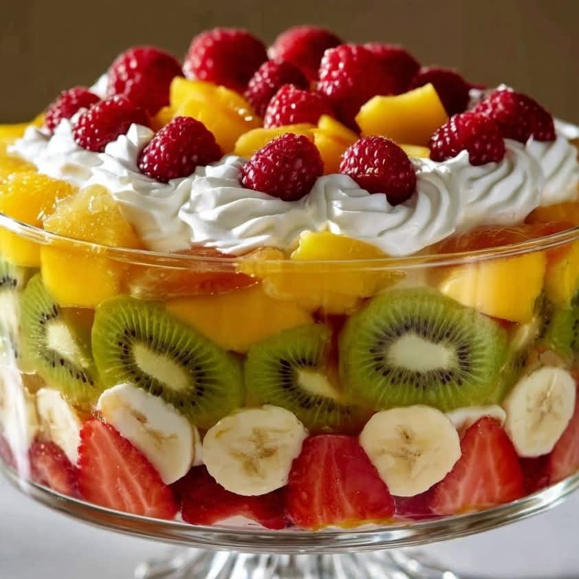 A fruit trifle is a layered dessert typically made with sponge cake, custard, fresh fruits, jelly (optional), and whipped cream. It’s visually stunning in a glass bowl, making it perfect for parties or family gatherings. The layers create a combination of textures: soft cake, creamy custard, juicy fruits, and fluffy whipped cream.