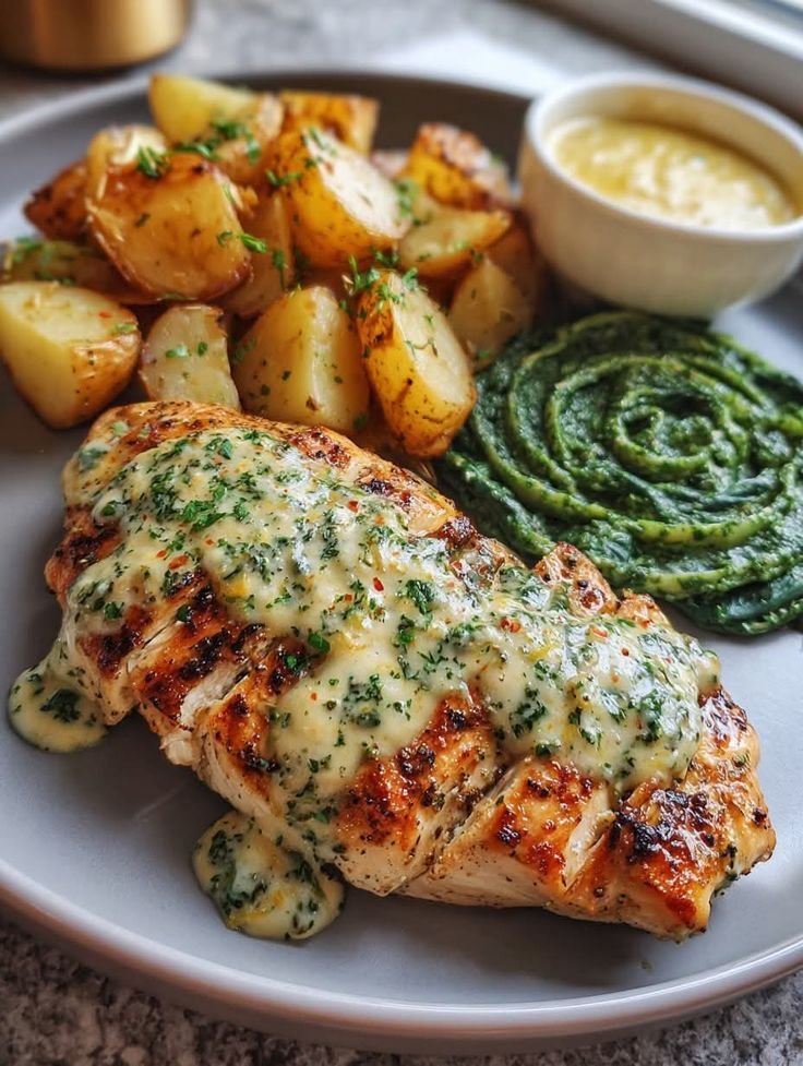 Creamy, garlicky Alfredo pasta meets golden grilled chicken and crispy parmesan potatoes — topped with a swirl of fresh spinach-basil pesto for brightness and aroma. It’s indulgent yet balanced, combining crisp textures, herby freshness, and silky Alfredo cream in one irresistible bowl.