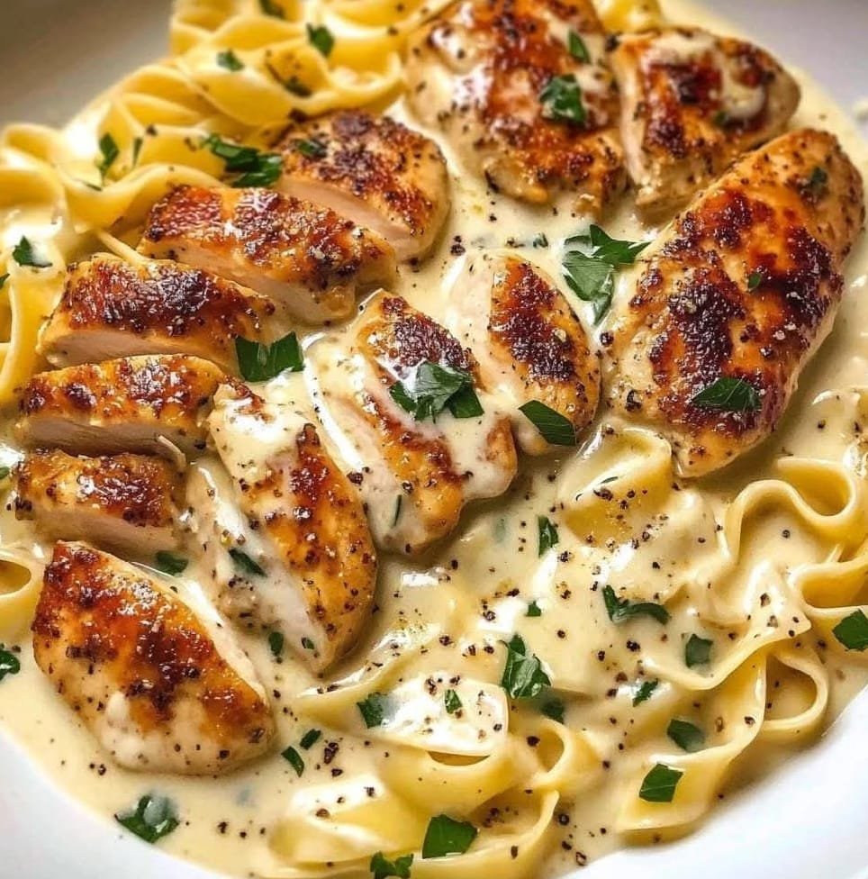 11. Slice the rested chicken and place it on top of the creamy pasta.