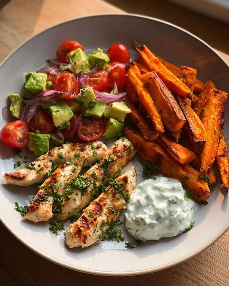 Tender garlic-herb marinated chicken served alongside crispy baked sweet potato fries and a medley of roasted vegetables — a wholesome, well-balanced meal packed with color, flavor, and nutrition.