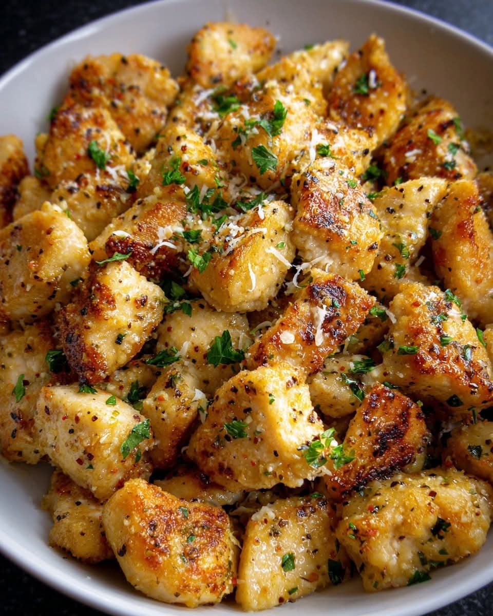Garlic Parmesan Chicken Bites are small, juicy pieces of chicken coated in a light breading, pan-seared or air-fried until golden, then tossed in a rich garlic-butter-Parmesan sauce. They’re easy to make, ready in under 30 minutes, and ideal for weeknight dinners or party platters.