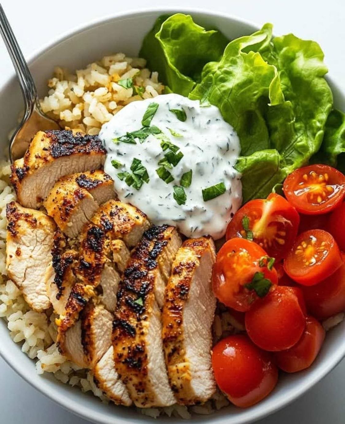 Here’s a full recipe for Mediterranean Grilled Chicken Bowl with rice, fresh lettuce, cherry tomatoes, and a creamy herb yogurt sauce!