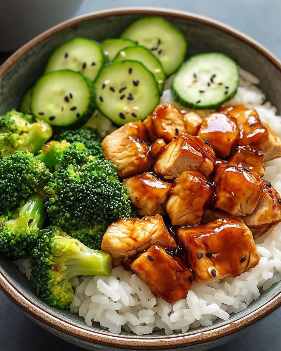 This glazed chicken rice bowl is a perfect high-protein, nutrient-rich meal that balances flavors and textures. Juicy glazed chicken is served over fluffy rice with steamed broccoli and crisp cucumber, creating a sweet, savory, and refreshing dish. It’s an easy and wholesome meal that’s great for meal prep or a quick weeknight dinner!
