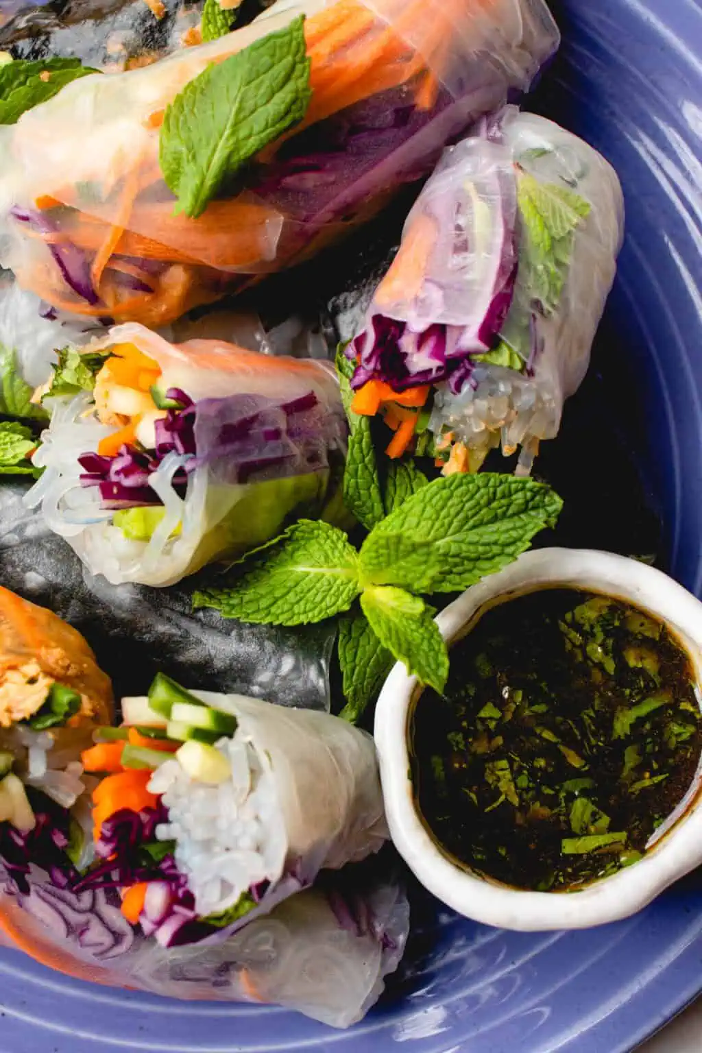 Serving: Serve the spring rolls fresh, as the rice paper can become tough if stored for too long. If you need to store them, cover them with a damp cloth and keep them in an airtight container in the refrigerator for up to a day.