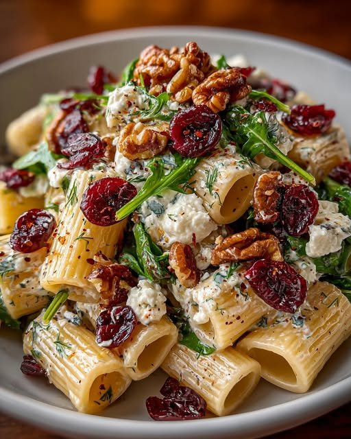 Goat Cheese and Cranberry Rigatoni Salad with Lemon Vinaigrette is a vibrant pasta dish that balances creamy, tangy, sweet, and fresh flavors in a simple yet satisfying way. Tender rigatoni pasta forms the base, while crumbled goat cheese adds richness and a smooth texture that melts slightly into the warm pasta. Dried cranberries bring a pop of sweetness, toasted nuts offer crunch, and fresh greens give the salad brightness and color. The lemon vinaigrette ties everything together with a light citrusy finish that keeps the dish refreshing rather than heavy. This salad works perfectly as a make-ahead lunch, a potluck favorite, or a flavorful side for grilled chicken, seafood, or roasted vegetables. It is flexible enough to adapt to different preferences and seasons while remaining quick and easy to prepare.