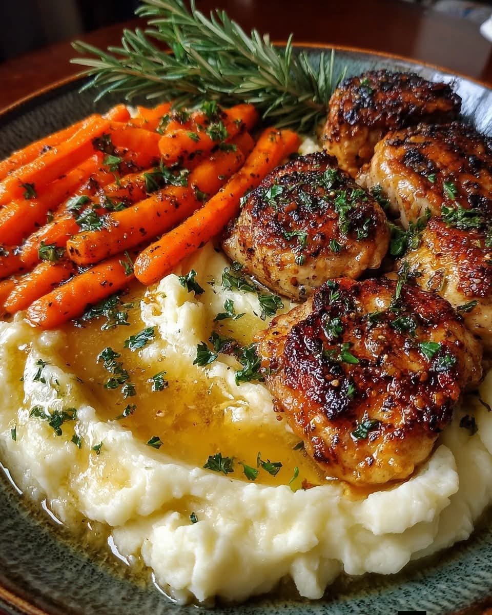 Golden Garlic Herb Chicken with Cloud Soft Mashed Potatoes and Honey Butter Carrots is the kind of comforting, complete meal that feels special without being complicated. Juicy chicken is coated in fragrant garlic, rosemary, and thyme, then cooked until beautifully golden and flavorful. Creamy mashed potatoes provide a soft, buttery base, while tender carrots glazed in honey and butter add a gentle sweetness and vibrant color to the plate. This balanced dish is perfect for family dinners, weekend cooking, or whenever you want a cozy, satisfying meal that looks and tastes like classic home comfort food.