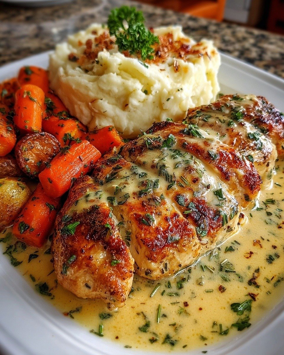 Golden Garlic Herb Chicken with Creamy Mashed Potatoes and Honey Butter Carrots