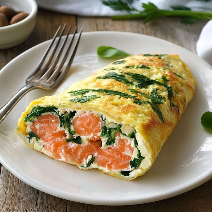 A soft, fluffy omelette sheet rolled with creamy herbed cheese, sauteed spinach, and delicate smoked salmon. Beautiful presentation, simple technique, restaurant-style result.