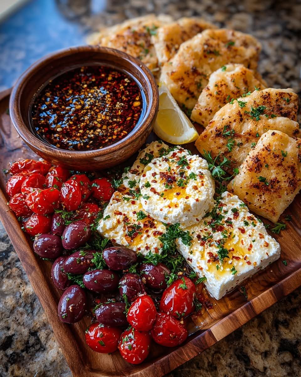 Greek Appetizer Board with Hot Honey Feta, Olives & Flatbread Chips
