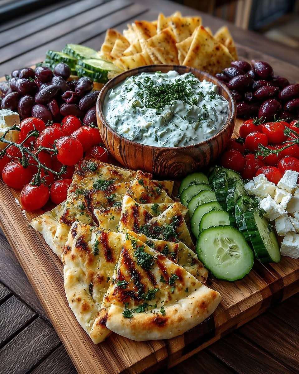 This vibrant Mediterranean-style mezze board brings together creamy tzatziki, crispy pita chips, briny olives, fresh vegetables, and tangy cheeses. It’s a no-fuss, crowd-pleasing spread that’s both healthy and satisfying, offering a balance of textures and bold Greek flavors.