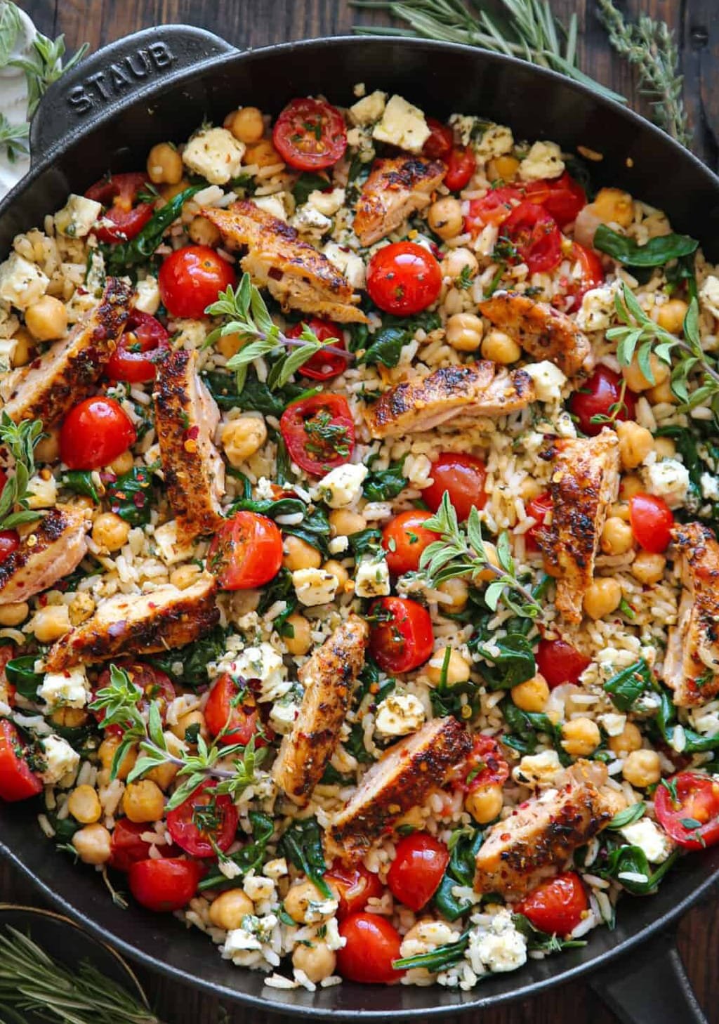 Greek Chicken and Lemon Rice is a 30-minute one-pot dinner packed with so much flavor! This Mediterranean recipe features spinach, grape tomatoes, chickpeas (garbanzo beans), feta cheese, paprika, and oregano. It’s healthy, gluten-free, protein-rich, fiber-rich, and can be easily made dairy-free.