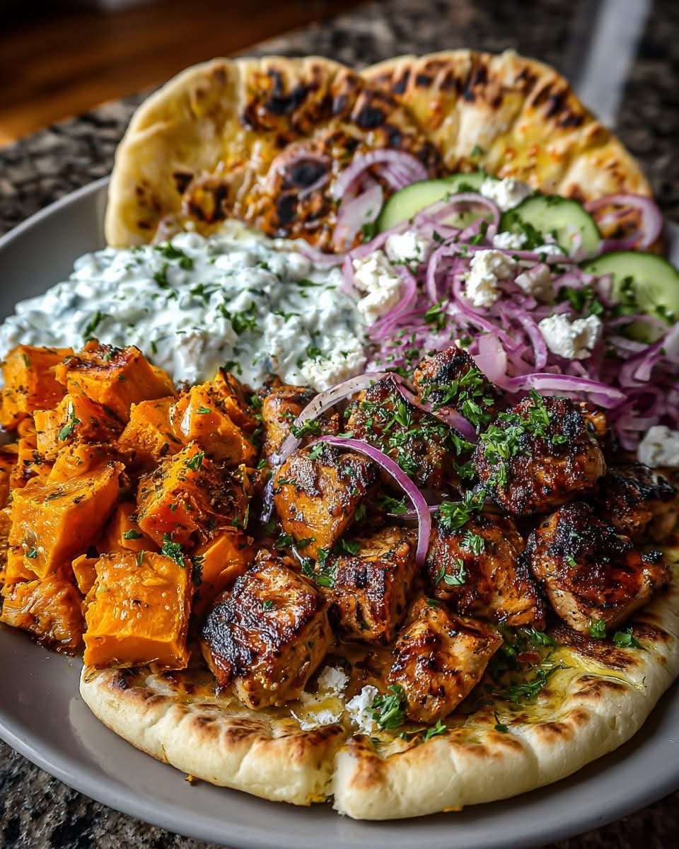 Greek Chicken Souvlaki is a traditional street food featuring marinated grilled chicken skewers, served here with roasted sweet potatoes and warm pita. This nutritious meal combines zesty Mediterranean flavors with the natural sweetness of roasted root vegetables — balanced, delicious, and perfect for meal prep or family dinners.