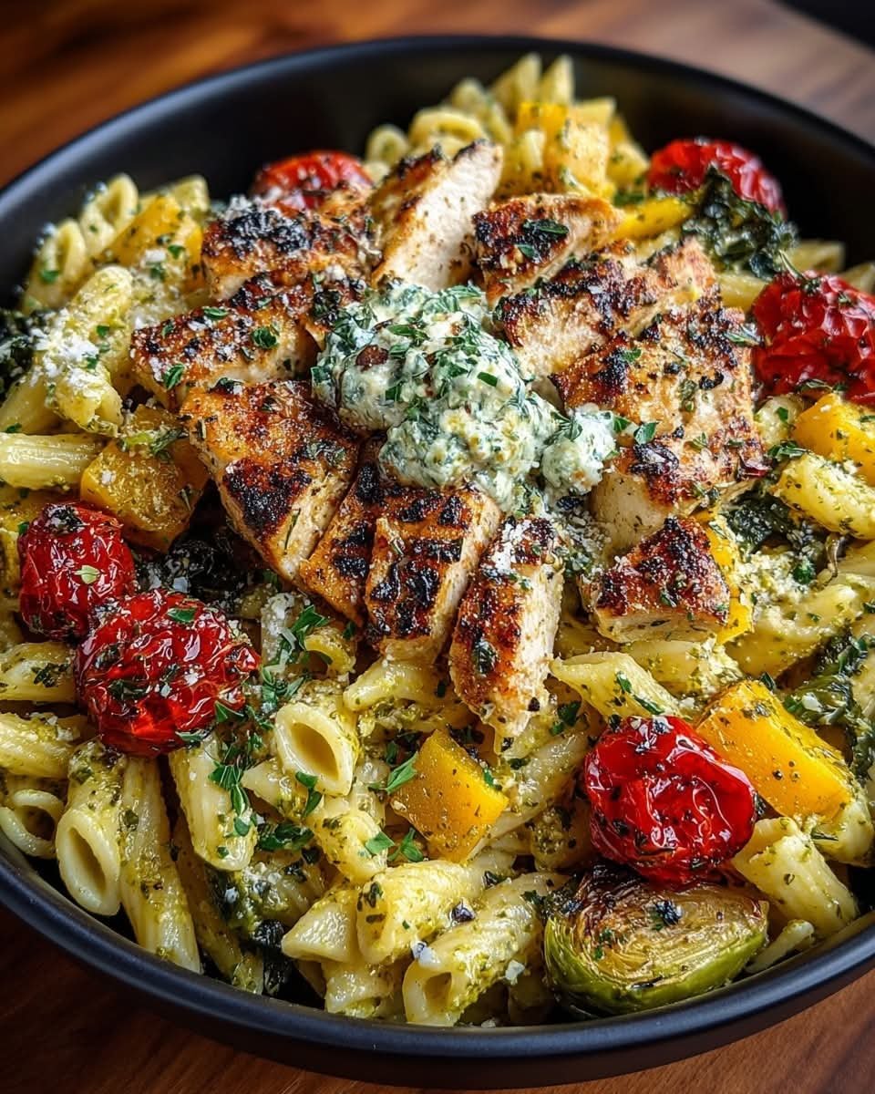 Bright, creamy, herby, and cozy all at once—this dish combines juicy Greek-marinated chicken, roasted fall vegetables, silky whipped feta, and zesty lemon pesto tossed with pasta. It’s nourishing, restaurant-worthy, and perfect for weeknights or entertaining.