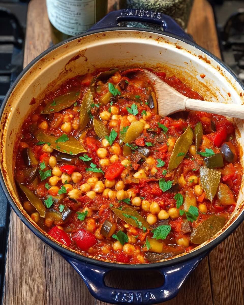 Simmer for 25–30 minutes until eggplant is tender and the stew thickens.