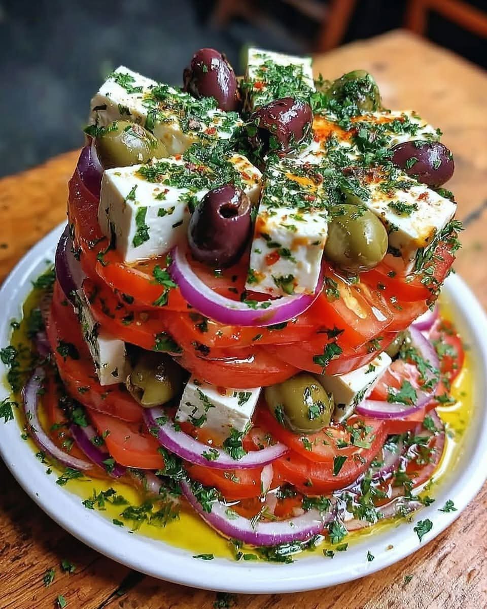 Greek Feta Salad Tower is a visually stunning twist on traditional Greek salad, layered vertically for a restaurant-style presentation. It combines crisp cucumbers, juicy tomatoes, briny olives, creamy feta cheese, and fresh herbs, finished with a simple olive oil dressing. It’s refreshing, healthy, low-carb, and ready in minutes — perfect for entertaining or clean eating.