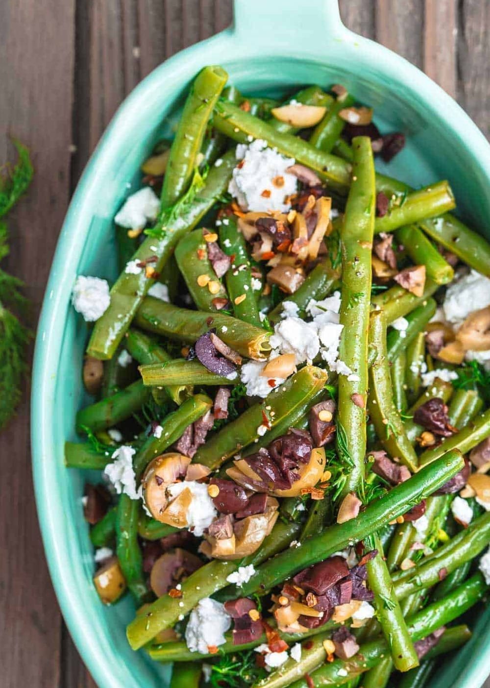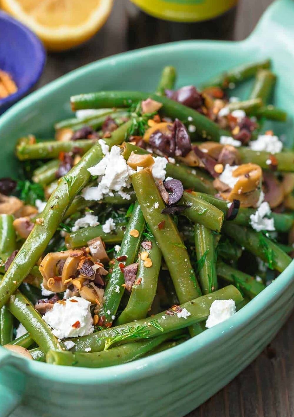 Make ahead instructions. You can cook the green beans and toss in dressing the night before, if you like. Keep in fridge in tightly covered glass container. Remove from fridge and follow step Transfer to serving platter and add crushed pepper flakes, feta and olives. Serve at room temperature.