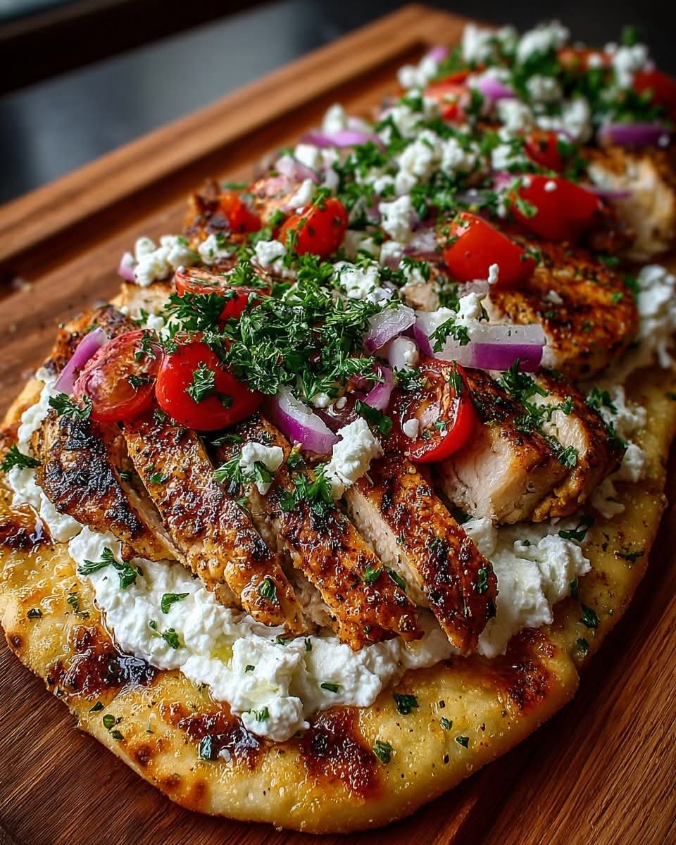 This Greek Grilled Chicken Flatbread with Whipped Feta & Honey brings together juicy herb-marinated grilled chicken, a luxuriously creamy whipped feta spread, fresh Mediterranean toppings, and a delicate drizzle of honey for balance. It’s quick enough for a weeknight meal yet elegant enough to serve guests. The contrast of salty feta, warm flatbread, tender chicken, and floral honey makes every bite irresistible.