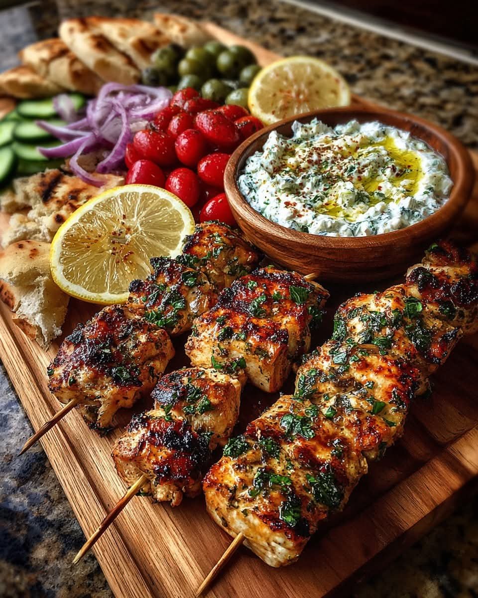 This vibrant Greek-style grazing board combines juicy, marinated grilled chicken souvlaki skewers with a rich and tangy garlic feta dip. Paired with warm pita bread, fresh vegetables, olives, and herbs, it’s perfect for sharing—ideal for family dinners, gatherings, or a restaurant-style meal at home. The flavors are bold yet refreshing, with hints of lemon, garlic, oregano, and creamy feta tying everything together.