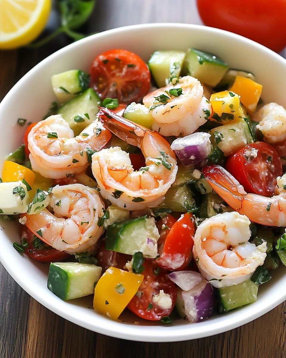 Indulge in the bold flavors and aromas of Greece with this stunning shrimp salad! This refreshing recipe combines succulent shrimp, crunchy vegetables, creamy feta cheese, and a zesty Greek vinaigrette, all perfectly balanced to transport your taste buds to the Mediterranean.